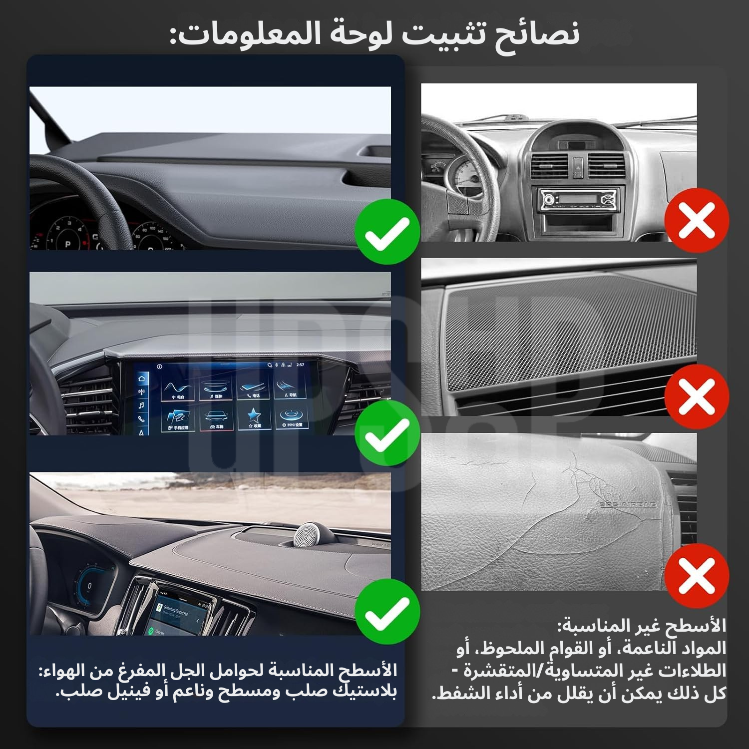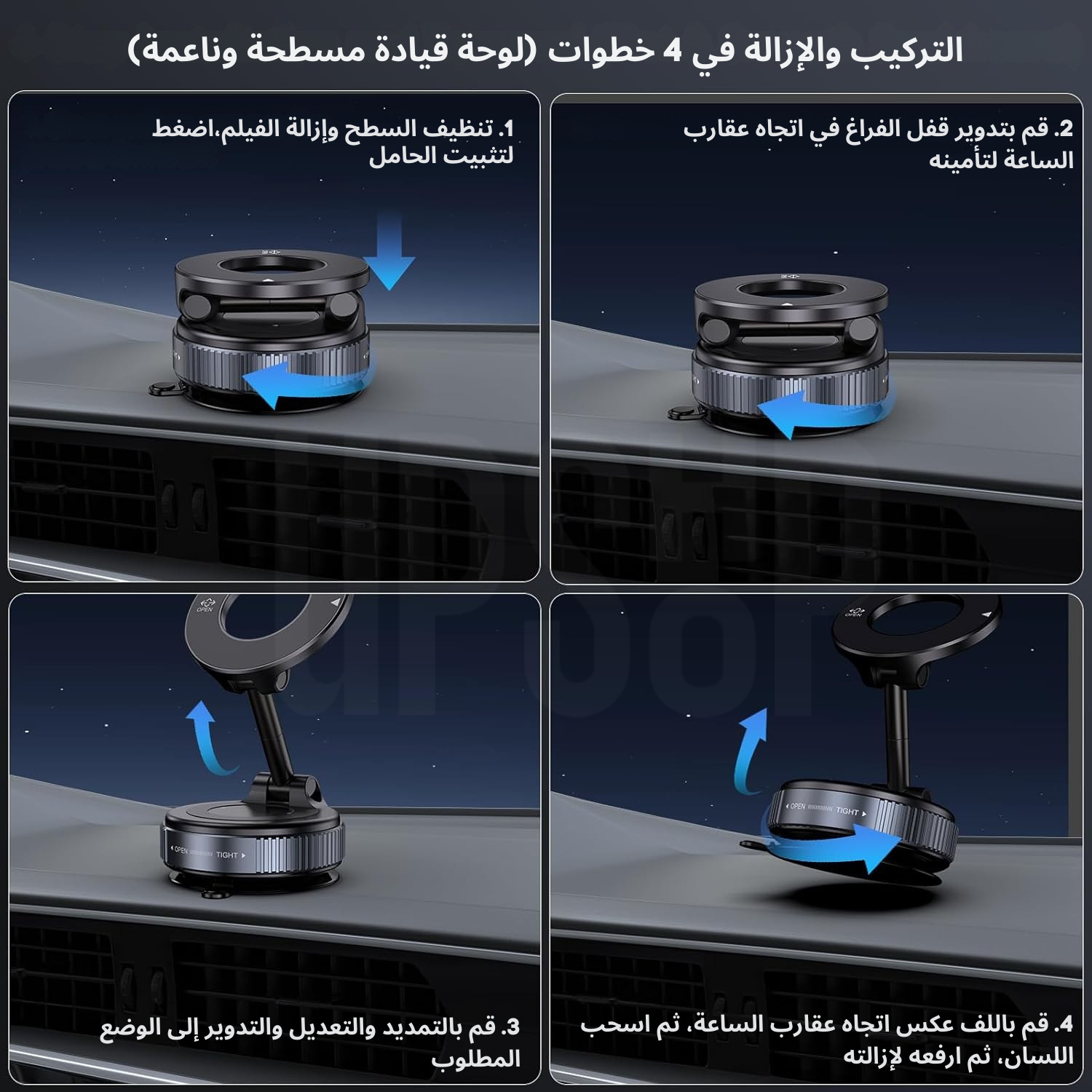 قفل تفريغ + قاعدة جل – للأسطح الملساء والمسطحة: يتميز بقفل تفريغ دوار وقاعدة جل قابلة للغسل من أربع طبقات، مما يوفر ثباتًا فائقًا على الأسطح المسطحة غير المزخرفة، مثل الزجاج، ولوحات القيادة اللامعة، والجلد الصلب. تجنب استخدامه على المواد المنحنية، أو الناعمة، أو المزخرفة. للتركيب، اضغط بقوة على قاعدة الجل وأدر قفل التفريغ باتجاه عقارب الساعة حتى يُحكم.